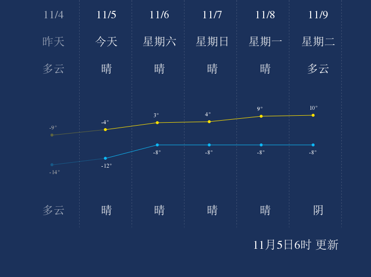 预计,今天白天晴,最高气温-4℃,微风,今天夜间晴,最低气温-12℃,微风。