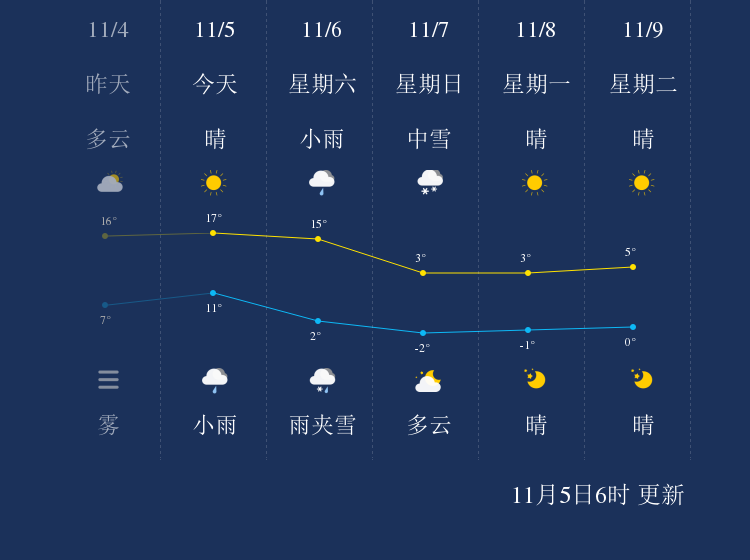 中国天气网讯 今天是11月5日星期五,一起来看天气。