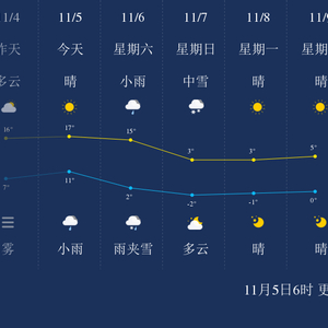 - 降水提醒:预计今天有晴转小雨、明天有小雨转雨夹雪。出门记得带伞并注意交通安全。