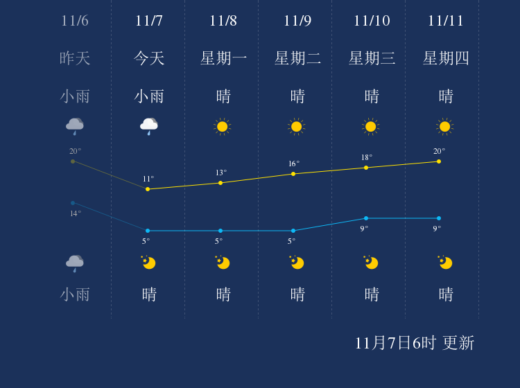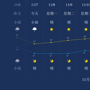 预计,今天白天小雨,最高气温11℃,东北风4-5级,今天夜间晴,最低气温5℃,东北风3-4级。