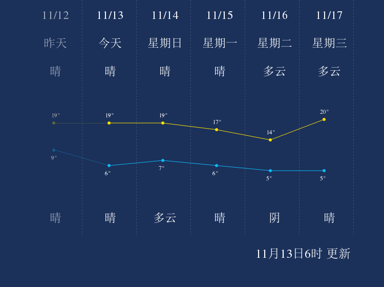 中国天气网讯 今天是11月13日星期六,一起来看天气。