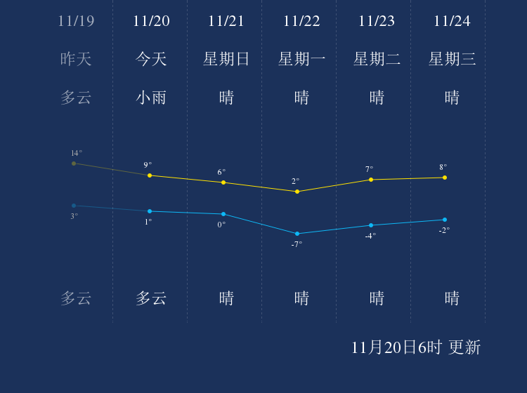 中国天气网讯 今天是11月20日星期六,一起来看天气。
