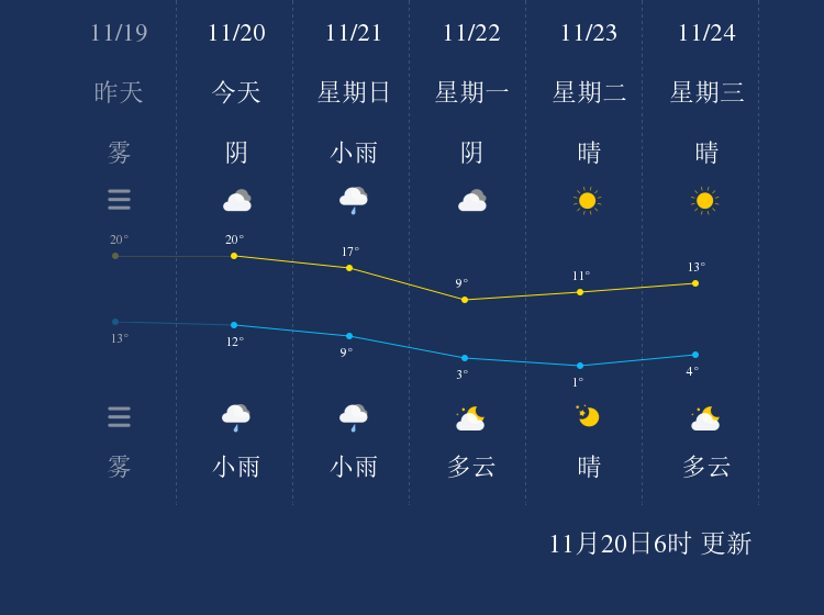 中国天气网讯 今天是11月20日星期六,一起来看天气。