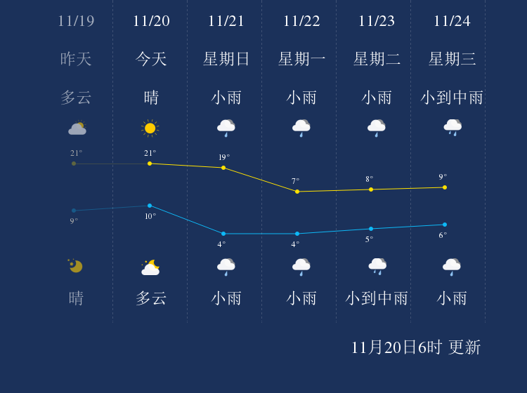 中国天气网讯 今天是11月20日星期六,一起来看天气。