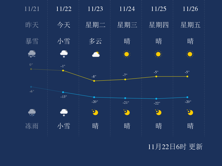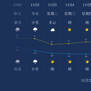 预计,今天白天小雪,最高气温-1℃,西风3-4级,今天夜间小雪,最低气温-13℃,微风。