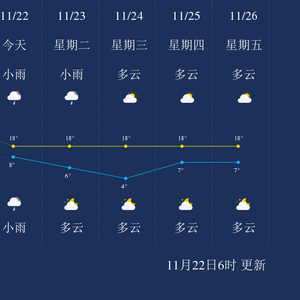 预计,今天白天小雨,最高气温18℃,微风,今天夜间小雨,最低气温8℃,微风。