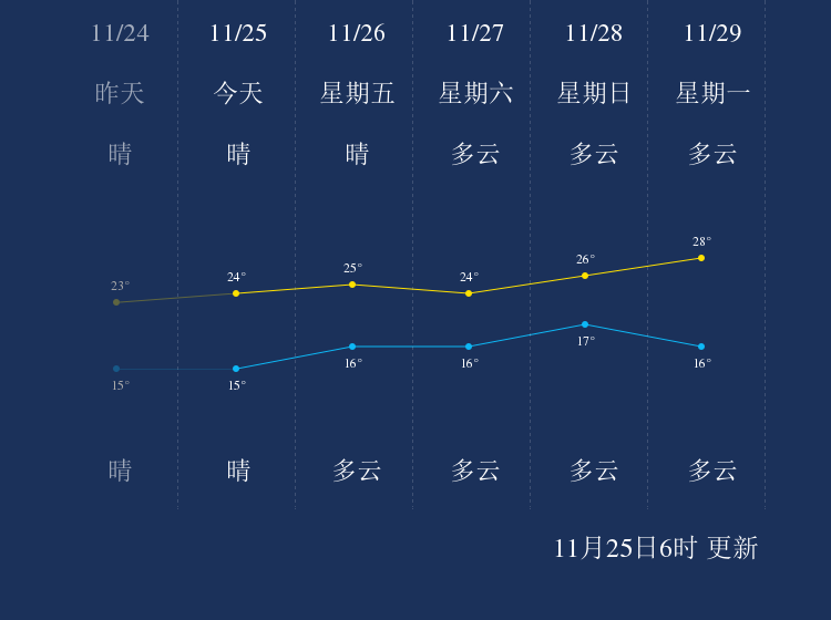中国天气网讯 今天是11月25日星期四,一起来看天气。