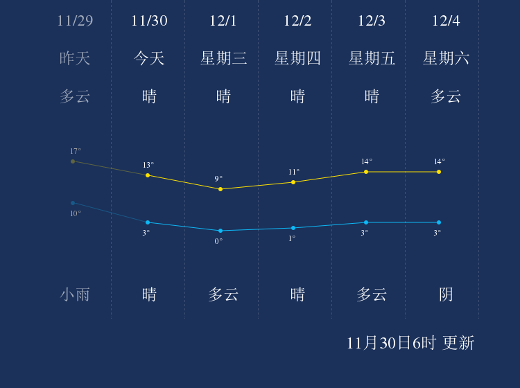 中国天气网讯 今天是11月30日星期二,一起来看天气。