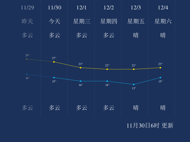 中国天气网讯 今天是11月30日星期二,一起来看天气。
