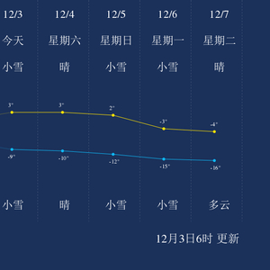 预计,今天白天小雪,最高气温3℃,微风,今天夜间小雪,最低气温-9℃,微风。