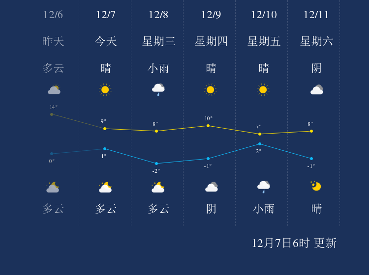 预计,今天白天晴,最高气温9℃,微风,今天夜间多云,最低气温1℃,微风。