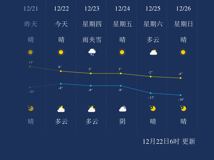 中国天气网讯 今天是12月22日星期三,一起来看天气。