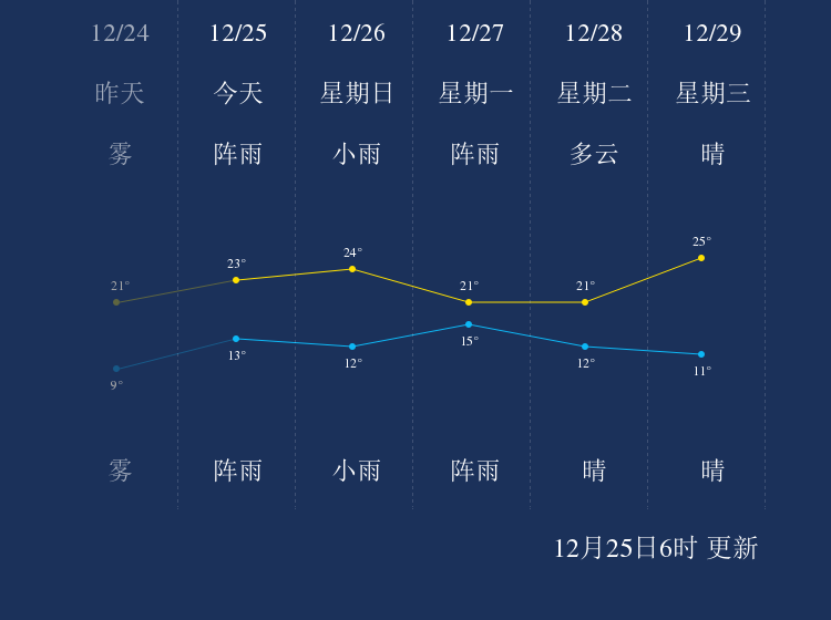 预计,今天白天阵雨,最高气温23℃,微风,今天夜间阵雨,最低气温13℃,微风。
