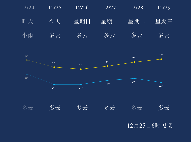 预计,今天白天多云,最高气温2℃,北风3-4级,今天夜间多云,最低气温-5℃,微风。