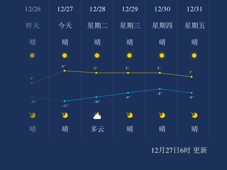 预计,今天白天晴,最高气温6℃,微风,今天夜间晴,最低气温-11℃,微风。