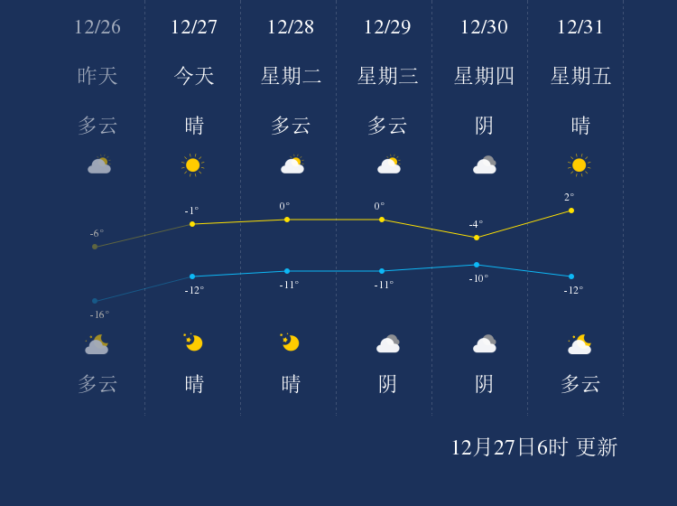 预计,今天白天晴,最高气温-1℃,微风,今天夜间晴,最低气温-12℃,微风。