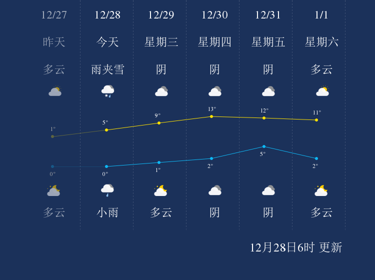 预计,今天白天雨夹雪,最高气温5℃,微风,今天夜间小雨,最低气温0℃,微风。