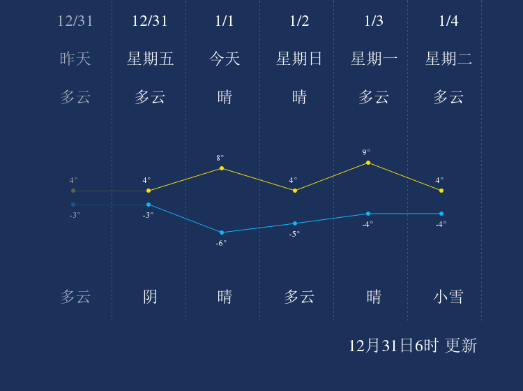 预计,今天白天多云,最高气温4℃,微风,今天夜间阴,最低气温-3℃,微风。