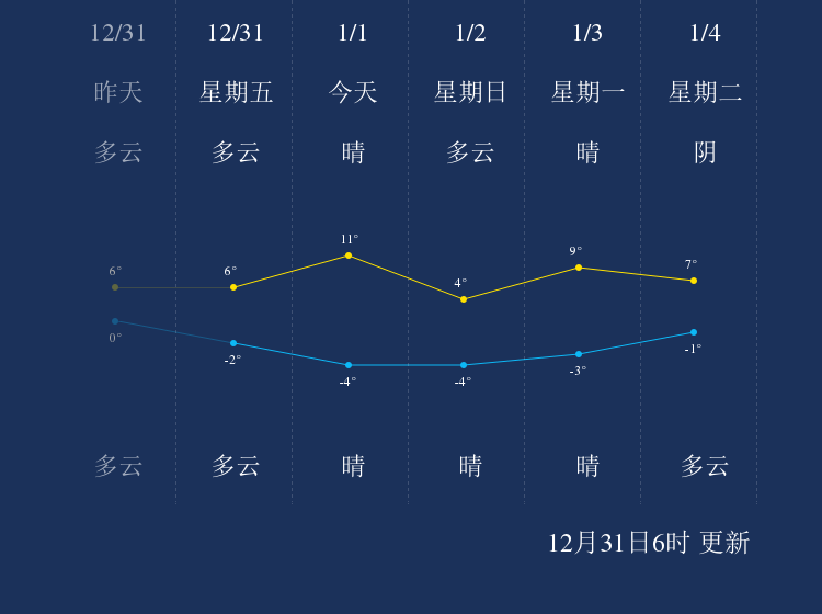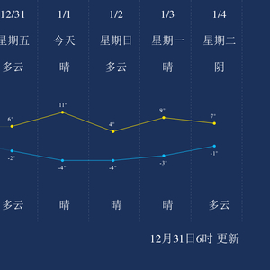 预计,今天白天多云,最高气温6℃,微风,今天夜间多云,最低气温-2℃,南风3-4级。