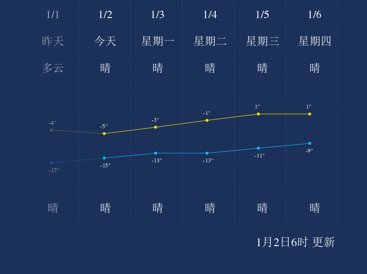 预计,今天白天晴,最高气温-5℃,微风,今天夜间晴,最低气温-15℃,微风。