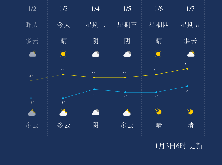 预计,今天白天晴,最高气温6℃,微风,今天夜间多云,最低气温-6℃,微风。