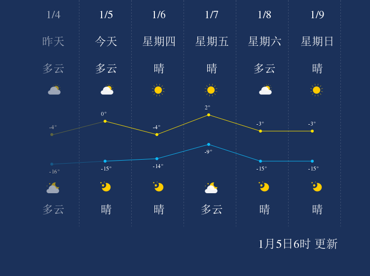 预计,今天白天晴,最高气温-6℃,微风,今天夜间晴,最低气温-16℃,微风。