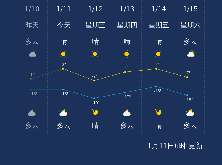预计,今天白天晴,最高气温-2℃,西风3-4级,今天夜间多云,最低气温-16℃,西北风3-4级。