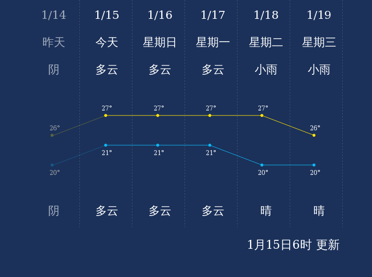 预计,今天白天多云,最高气温27℃,东风3-4级,今天夜间多云,最低气温21℃,东北风3-4级。
