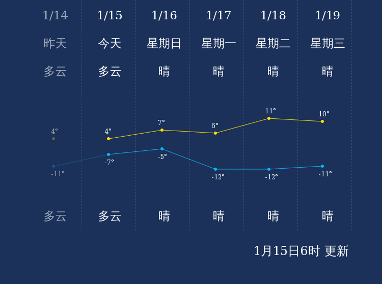 预计,今天白天多云,最高气温4℃,微风,今天夜间多云,最低气温-7℃,微风。