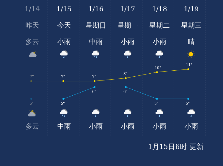 预计,今天白天小雨,最高气温7℃,微风,今天夜间中雨,最低气温5℃,微风。
