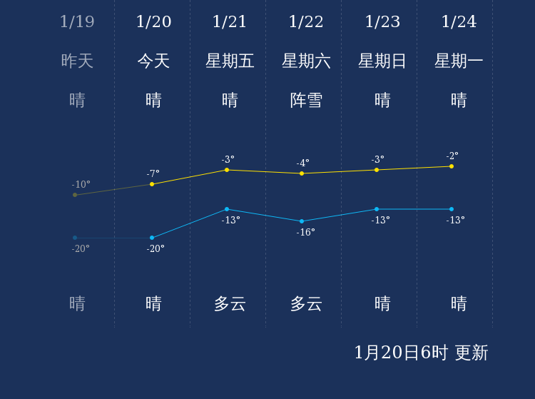 预计,今天白天晴,最高气温-7℃,微风,今天夜间晴,最低气温-20℃,微风。