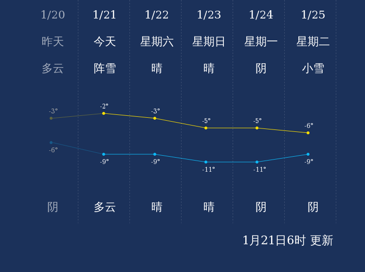预计,今天白天阵雪,最高气温-2℃,微风,今天夜间多云,最低气温-9℃,微风。