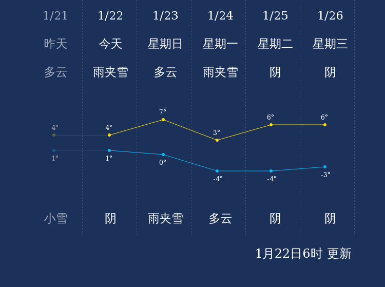 预计,今天白天雨夹雪,最高气温4℃,微风,今天夜间阴,最低气温1℃,东北风3-4级。