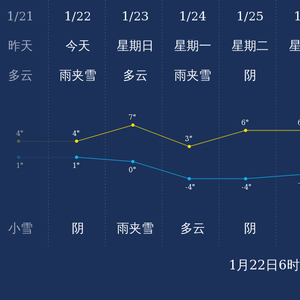 - 降水提醒:预计今天有雨夹雪转阴、明天有多云转雨夹雪。出门记得带伞并注意交通安全。