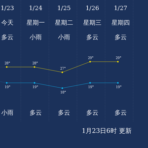 预计,今天白天多云,最高气温28℃,微风,今天夜间小雨,最低气温19℃,微风。