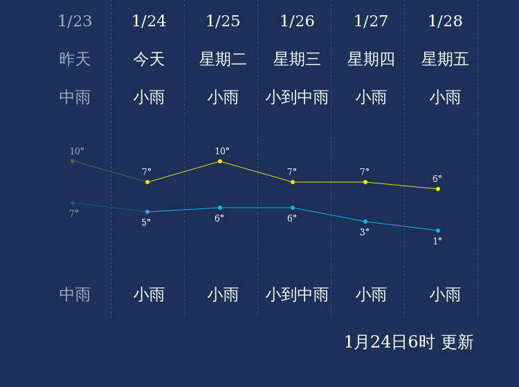 预计,今天白天小雨,最高气温7℃,北风3-4级,今天夜间小雨,最低气温5℃,微风。