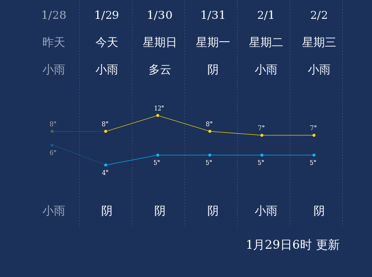 预计,今天白天小雨,最高气温8℃,微风,今天夜间阴,最低气温4℃,微风。