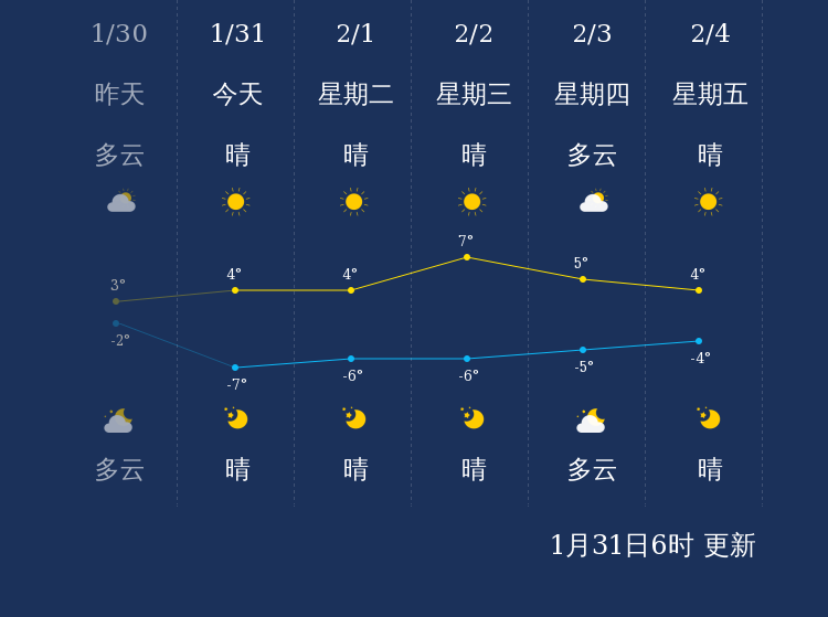 预计,今天白天晴,最高气温4℃,西北风3-4级,今天夜间晴,最低气温-7℃,微风。