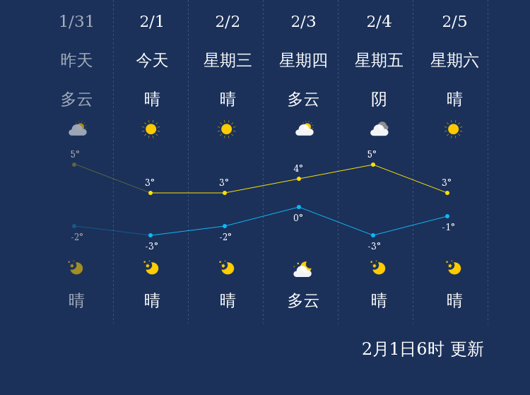 预计,今天白天晴,最高气温3℃,北风4-5级,今天夜间晴,最低气温-3℃,北风3-4级。