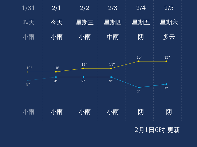 预计,今天白天小雨,最高气温10℃,微风,今天夜间小雨,最低气温9℃,微风。