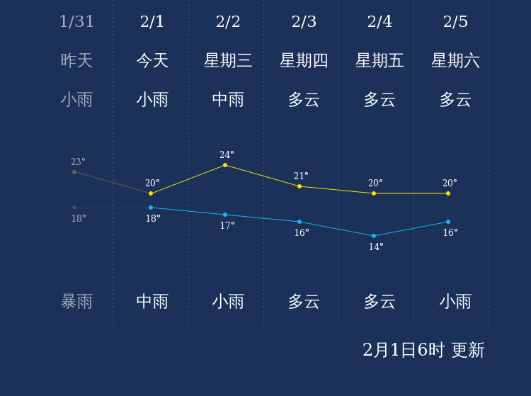 预计,今天白天小雨,最高气温20℃,微风,今天夜间中雨,最低气温18℃,微风。