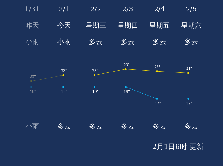 预计,今天白天小雨,最高气温23℃,微风,今天夜间多云,最低气温19℃,微风。