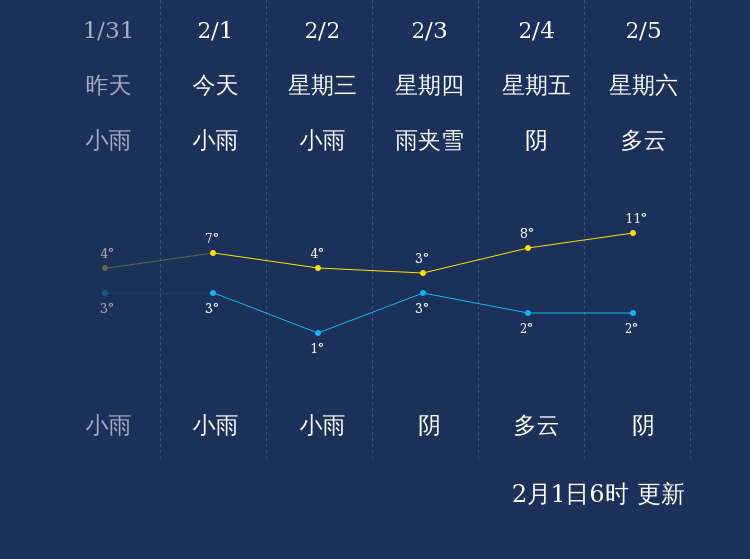 预计,今天白天小雨,最高气温7℃,微风,今天夜间小雨,最低气温3℃,北风3-4级。