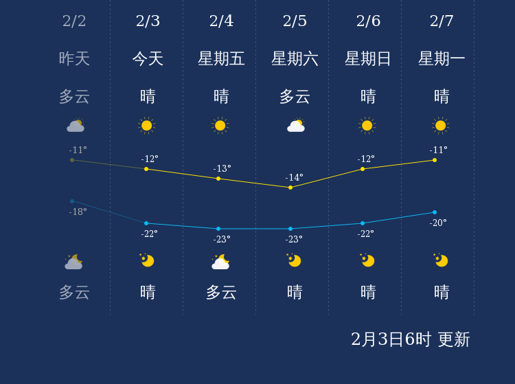 预计,今天白天晴,最高气温-12℃,西北风3-4级,今天夜间晴,最低气温-22℃,微风。