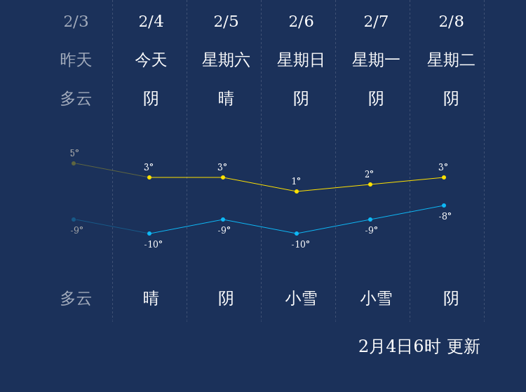 预计,今天白天阴,最高气温3℃,微风,今天夜间晴,最低气温-10℃,微风。