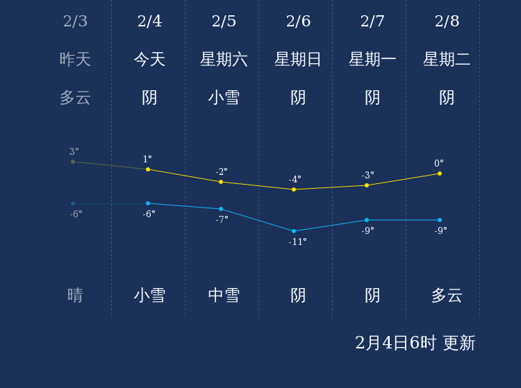 预计,今天白天阴,最高气温1℃,微风,今天夜间小雪,最低气温-6℃,微风。