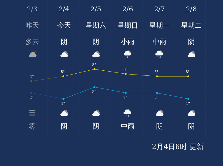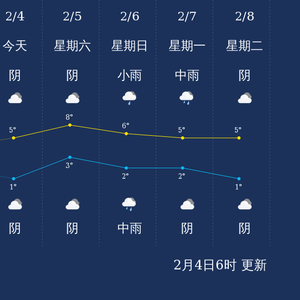 预计,今天白天阴,最高气温5℃,微风,今天夜间阴,最低气温1℃,微风。