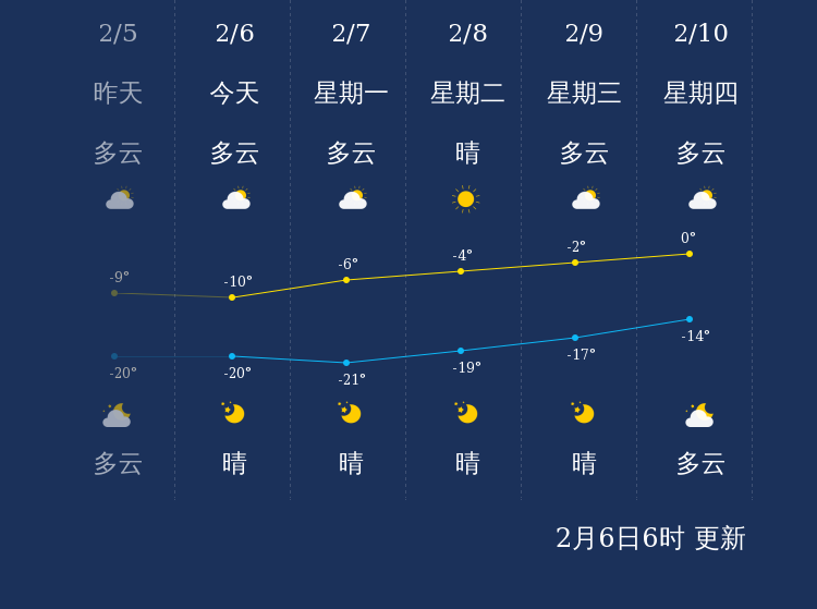 预计,今天白天多云,最高气温-10℃,微风,今天夜间晴,最低气温-20℃,微风。