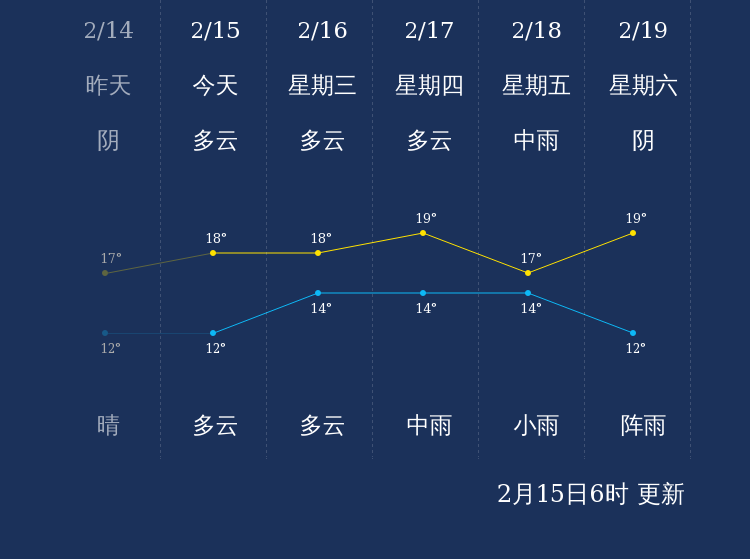 预计,今天白天多云,最高气温18℃,微风,今天夜间多云,最低气温12℃,微风。