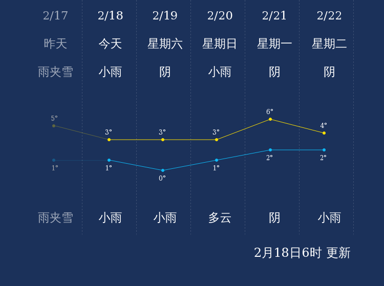 预计,今天白天小雨,最高气温3℃,微风,今天夜间小雨,最低气温1℃,微风。